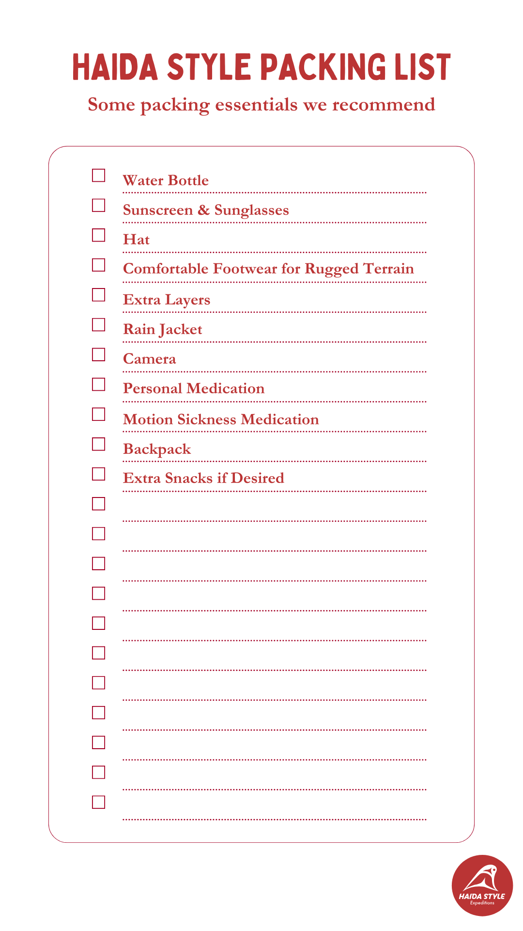 Download the suggested packing checklist and add your travel must haves in preparation for your journey to Haida Gwaii!